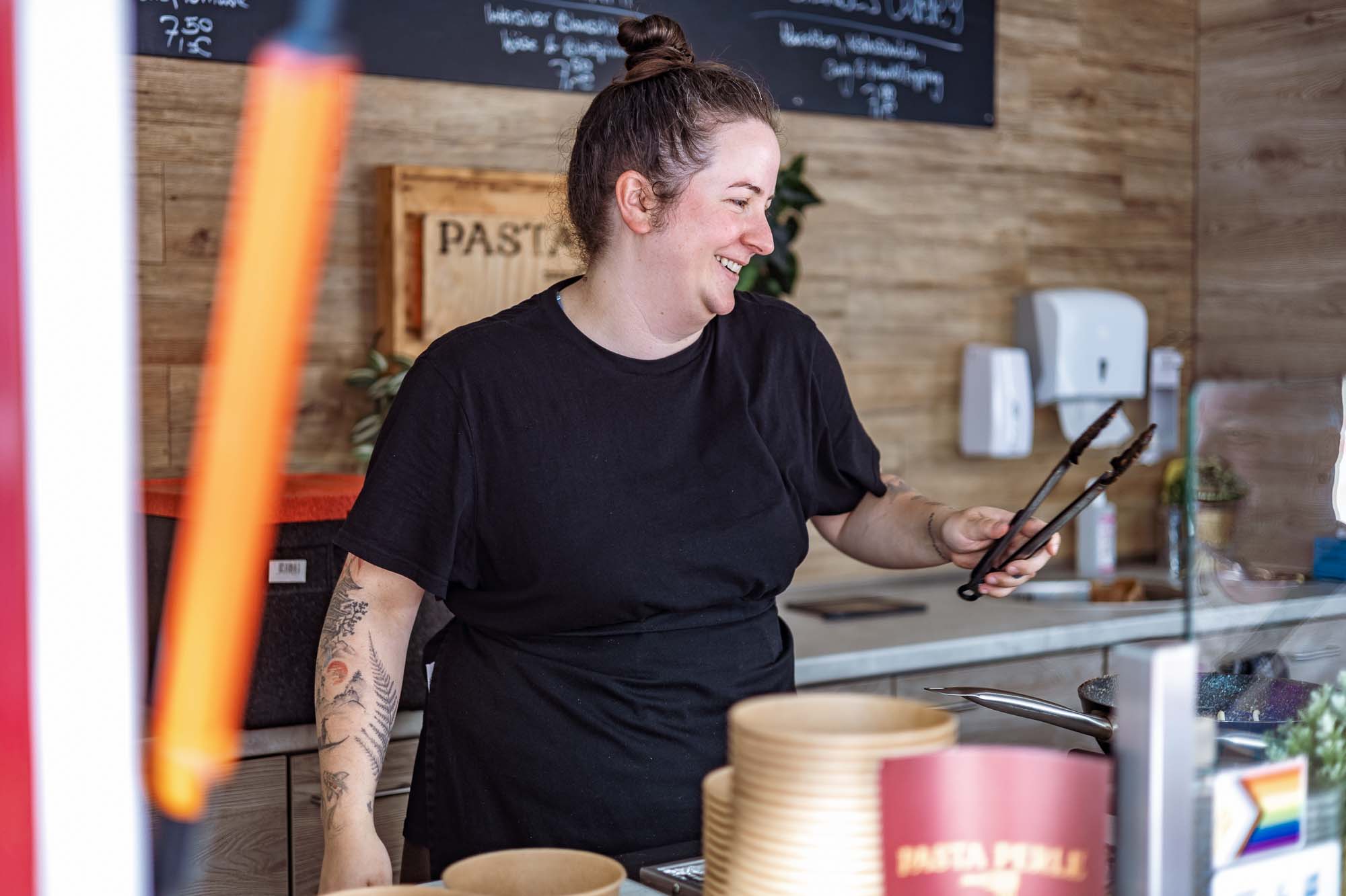Foodtruck-Köchin Anne bereitet frische Pasta zu – authentische Unternehmensfotografie während der Arbeit