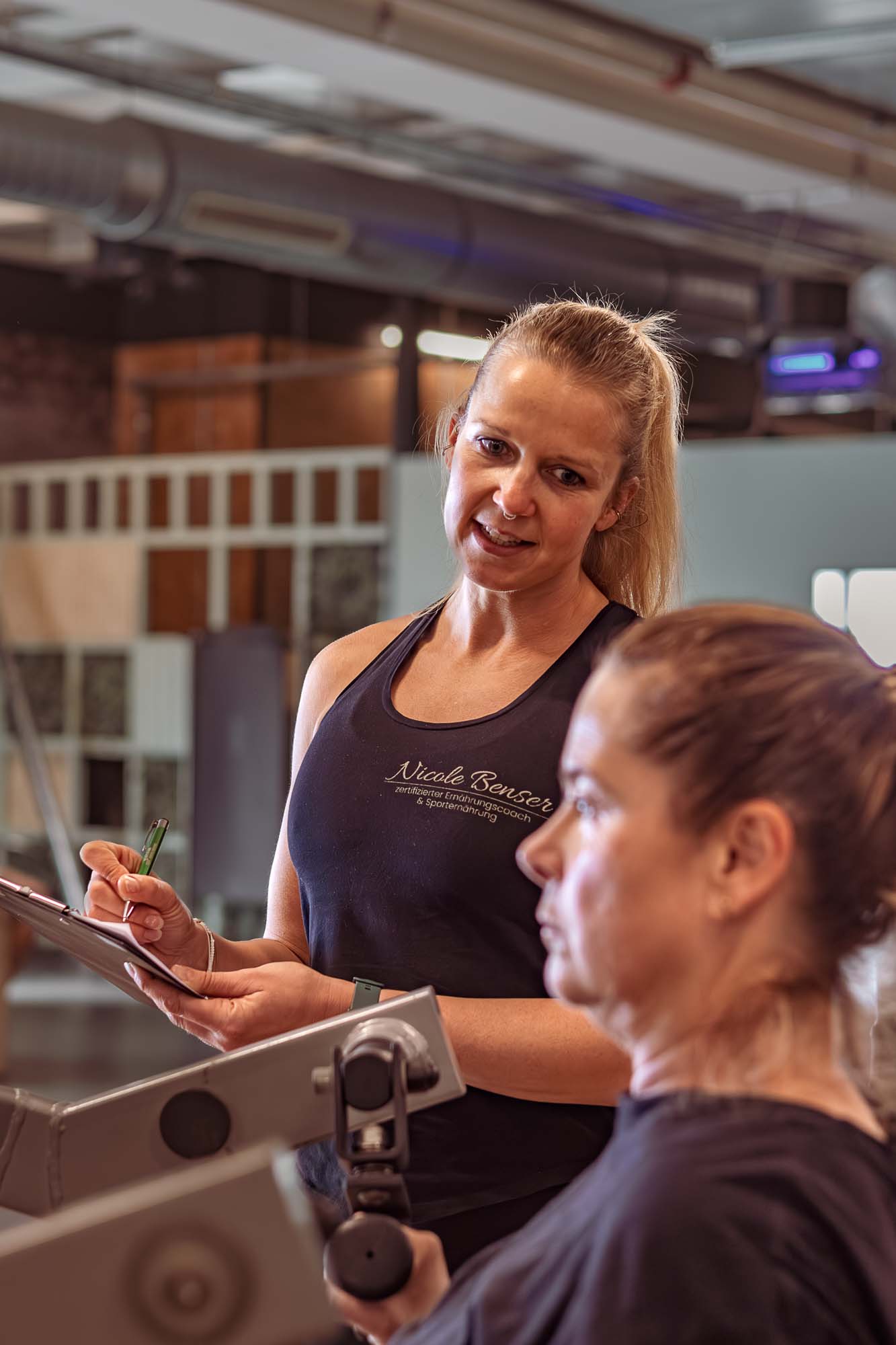 Personaltrainerin Nicole Benser im Coaching mit Kundin beim Krafttraining – authentische Unternehmensfotografie in Berlin