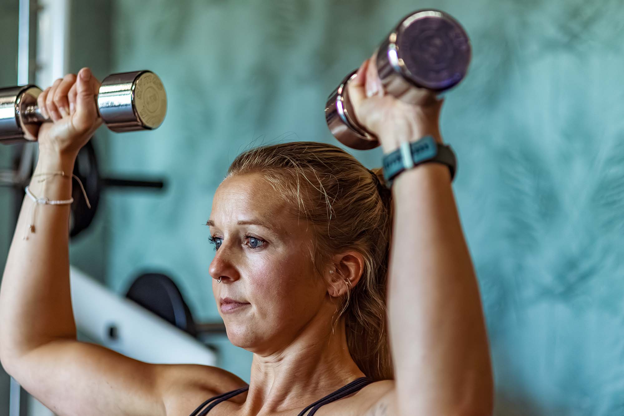 Personaltrainerin Nicole Benser motiviert Kundin beim Hanteltraining – echte Businessportraits aus Berlin-Brandenburg