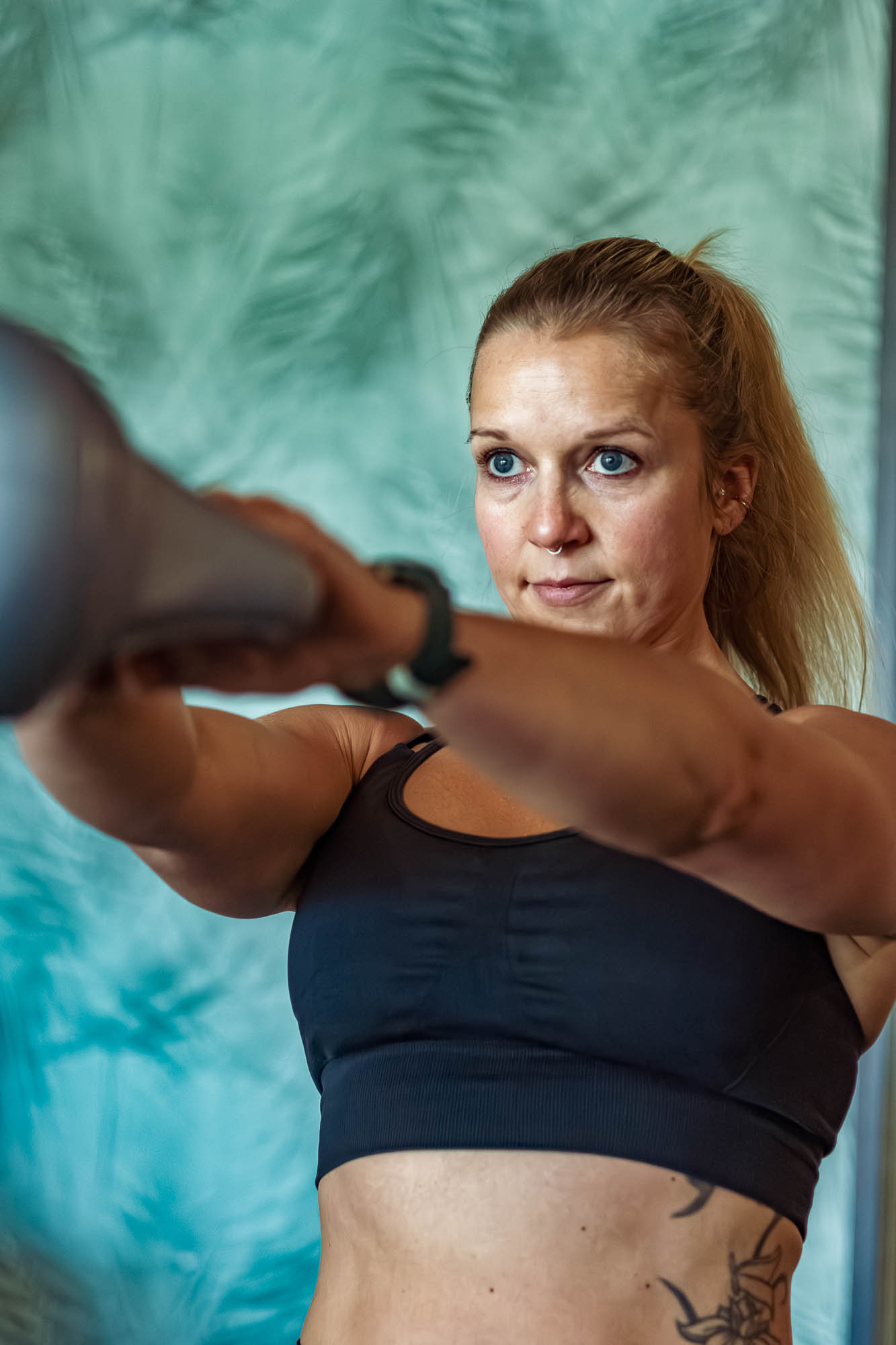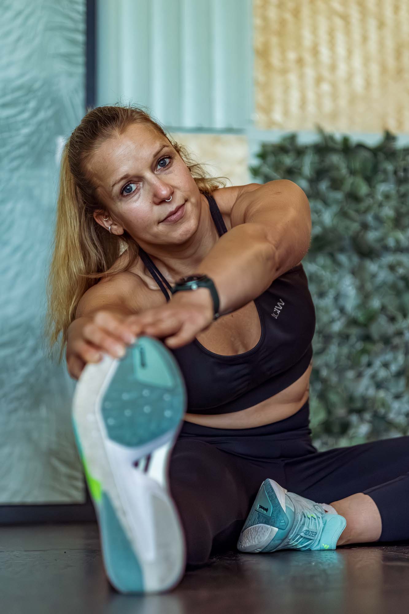 Personaltrainerin Nicole Benser in ruhigem Moment nach dem Workout – natürliche Businessfotografie für Selbstständige